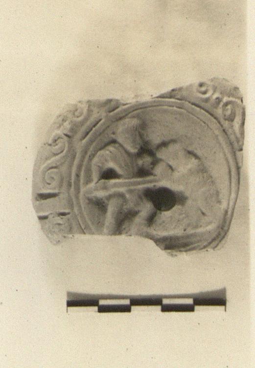 On discus, man and bear, the man fighting off the bear with a stout stock. On rim, reverse spirals.
