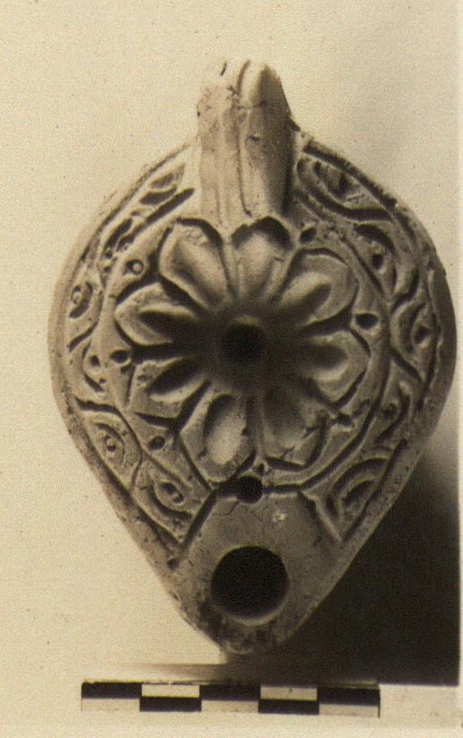 | Description: | Handle unpierced. On discus, rosette; on rim, vine pattern. Beneath, within two almond-shaped grooves, the signature. Unglazed. Light red clay. Type XXVIII of Corinth collection. | |