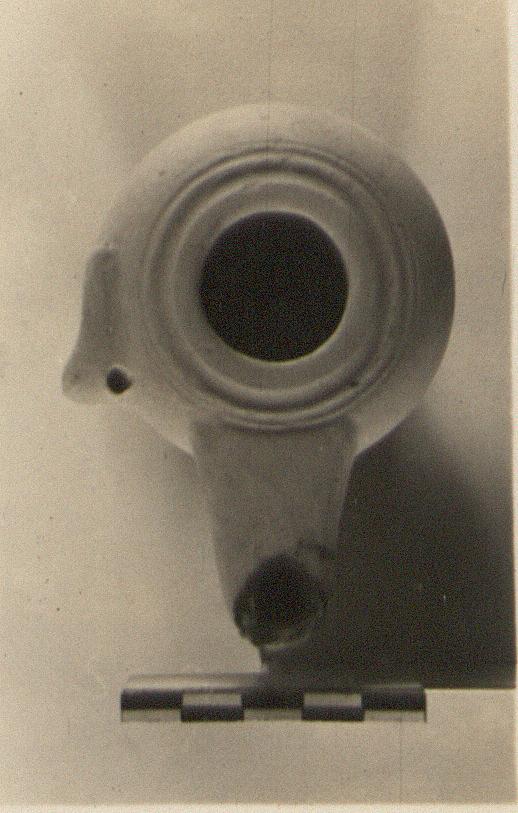 | Description: | Intact. High base, depressed beneath; body rounded, set off from narrow rim by two grooves; pierced lug, no handle. Black glaze inside only. Type 25B' of Agora collection, type VIIB of Corinth collection. | |