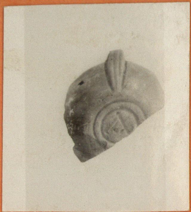 | Description: | Rear part of lamp only preserved. On rim, wavy lines. On reverse, within two concentric grooves, inscribed: "A". Handle, broken away above, doubly below. Thin purple glaze. Red clay. Type XXVIII of Corinth collection. | |