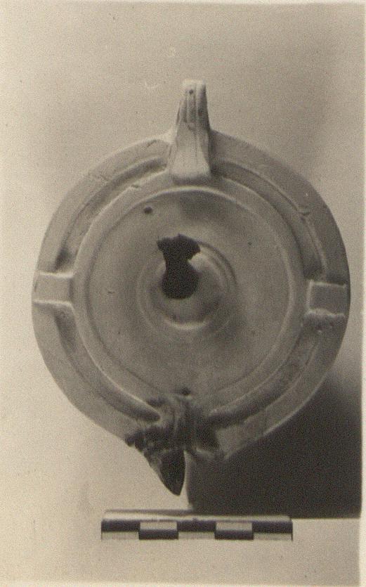 | Description: | Tip of nozzle and bit of discus missing. Pierced handle. Plain discus and panelled rim. Unglazed. Fine fabric; buff clay. Type XXVII of Corinth collection. | |