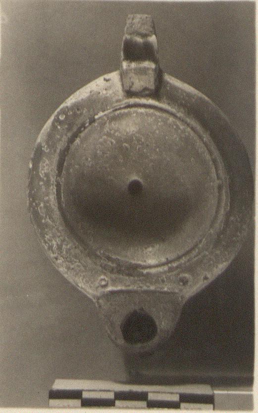 | Description: | Top of handle broken off. Grooved between rim and discus; single groove on reverse. Rim and discus plain, save for two small circles beside nozzle. Red glaze over white. Type XXV of Corinth collection. | |