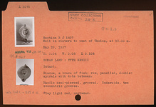 | Description: | Intact. Discus, a brace of fish. Rim panelled, double-spirals with dots between. Handle semi-pierced, grooved. Underside, two concentric grooves. Clay light red, unglazed. Type XXVIII of Corinth collection. Cf. Corinth IV, ii, pp. 102-114, nos. 786-1412, pls. XIII-XIX. | |