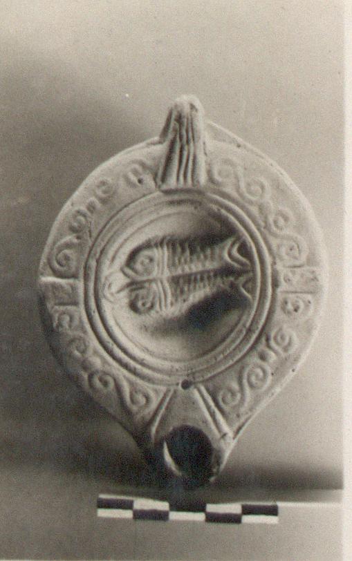 | Description: | Intact. Discus, a brace of fish. Rim panelled, double-spirals with dots between. Handle semi-pierced, grooved. Underside, two concentric grooves. Clay light red, unglazed. Type XXVIII of Corinth collection. Cf. Corinth IV, ii, pp. 102-114, nos. 786-1412, pls. XIII-XIX. | |