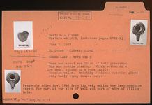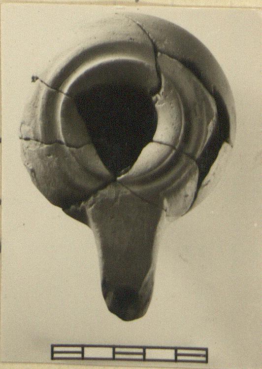| Description: | Base and about one-third of body preserved. Rim and nozzle missing. Thick bottom on a low base, rising to a cone inside. Rounded walls. Smootly finished outside; glaze red, badly worn, inside only. Type VIIB of Corinth collection, type 25B' of Agora collection. ADDENDA Fragments added November 1948, from tin 444, making the lamp complete except for part of one side of wall and part of edge of filling hole. | |