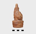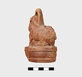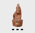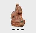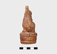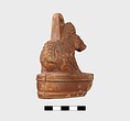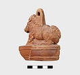 | Description: | Part of infundibulum broken away. A wild boar couchant, rests on a high base. A pierced suspension lug rises from his shoulders; in his back is the filling hole. Pale yellow clay covered with dull red paint. | |