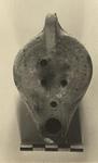 | Description: | Intact. Debased herringbone pattern on rim; cross (or Christian monogram?) on discus. Broad channel on neck. Solid handle without grooves. Almond-shaped reverse with grooved lines enclosing a palm branch. From very worn moulds. Light red clay and glaze. Type XXVIII of Corinth collection. | |