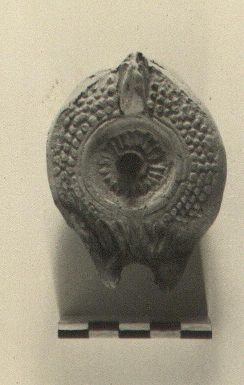 Globules on rim; flutes on neck; flat discus with raised rays. Smooth solid handle set entirely on rim. Shallow tails on under side, beneath handle.