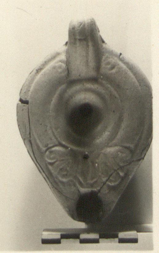 Discus plain. Rim, plain, with volutes at nozzle. Handle unpierced, two grooves above and below. On reverse, raised dots on lower half of body; within circular groove, the signature "K Y".