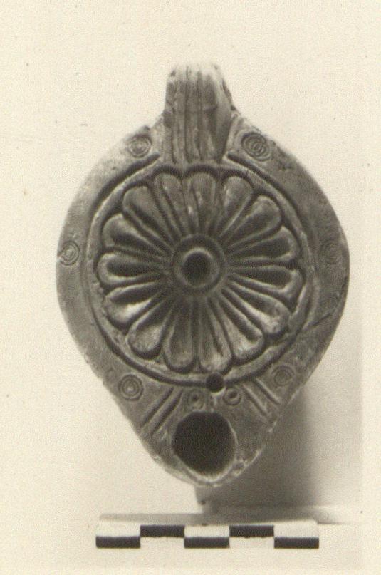 | Description: | Intact. On discus, rosette. Rim, plain, with small impressed concentric circles. Handle unpierced, three grooves above and two below. On reverse, two deep concentric grooves. Thin glaze; the whole blackened by fire. Type XXVIII of Corinth collection. | |