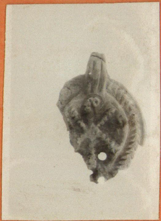 | Description: | Part of top preserved. On rim, herringbone pattern. On discus, Christian monogram; the bars are hatched; in the right quarter an "omega"; the left quarter (containing the "alpha"?) broken away; at the bottom, on either side of the stem of the "rho", a filling hole. Handle solid; double grooved. Thin purple glaze. Mottled gray and black clay. Type XXVIII of Corinth collection. Cf. Corinth IV, ii, no. 6, fig. 52. | |