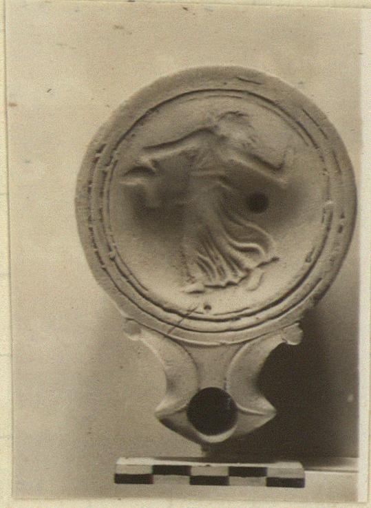 | Description: | On discus a frenzied maenad. She holds half of an animal in her left hand and a sword (?) in her right. The black glaze has almost entirely peeled off. Type XXV or XXII of Corinth collection. | |