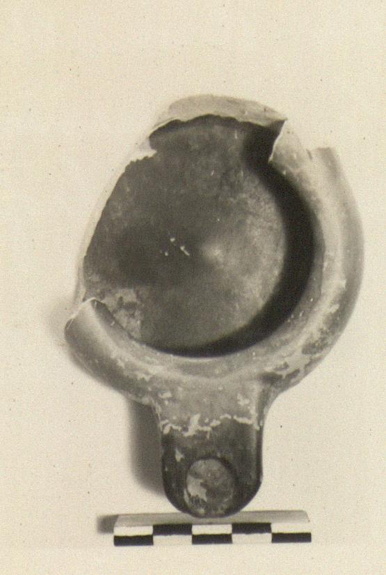 | Description: | Handle and part of side missing. Extremely low base; torus side wall. Horizontal band handle. Thin reddish-brown glaze outside; dark brown inside. Type IV of Corinth collection, type 21C of Agora collection. | |