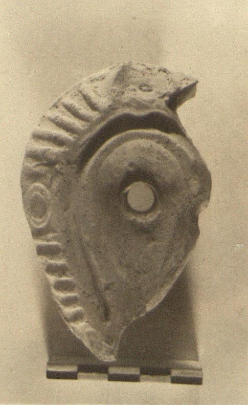 | Description: | Discus and left side of rim only preserved, broken all around. Plain horse-shoe-shaped discus, with channel into neck. Large single filling hole in center. Rim slopes down to a sharp shoulder and is decorated with nearly parallel radiating ridges, interrupted once on side by raised circle. Buff slip. Smooth light red clay. Type XXXIII of Corinth collection. | |
