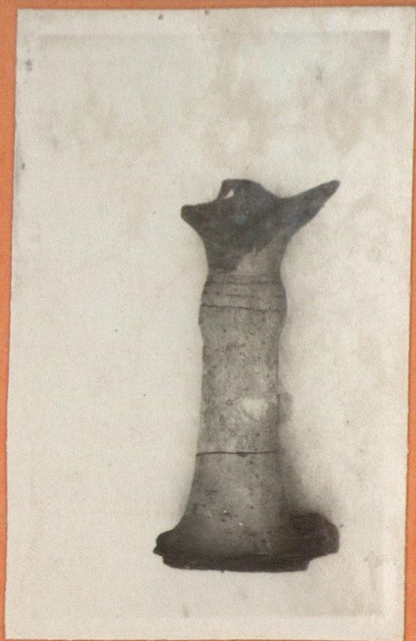 | Description: | Part of standard and oil bowl. A heavy stem, slightly hollow in its upper part, rises from a saucer-like base, and at the top flares out to form a shallow oil bowl. A projection, now broken off, rose from the center of this bowl. Just beneath the bowl the stem is slighly swollen and encircled by four parallel grooves. Coarse, yellow clay, unglazed save on the inside of the bowl which shows a dull yellow paint. Type XXXVI of Corinth collection. | |