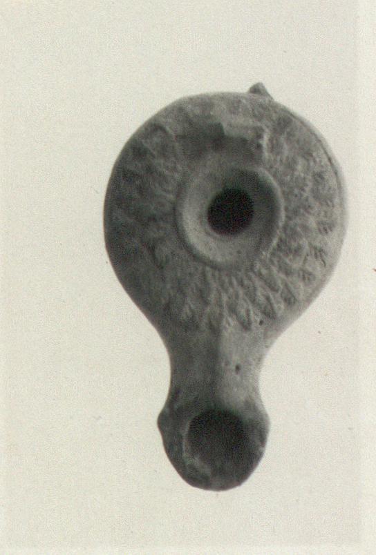 | Description: | Double convex body, with triangular nozzle and low, concave base. On rim, imbricated leaf pattern. On top, moulded rim around central filling hole. Remains of vertical band handle. Traces of black glaze. Gray clay. Type XVIII (post Sullan) of Corinth collection, type 55A of Agora collection. | |