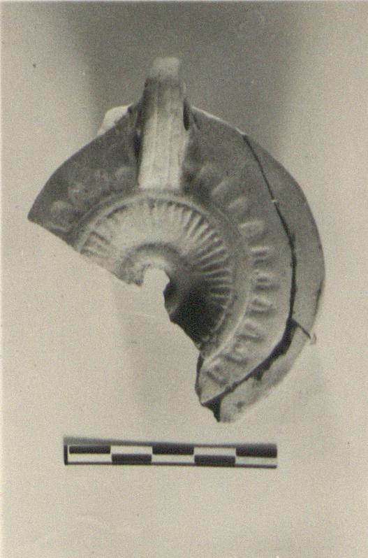 | Description: | Fragmentary; most of lower part, and nozzle missing. On rim, ovules; discus, depressed, with rays and ridge around filling hole. Pierced handle. Soft buff clay. Type XXVII of Corinth collection. | |