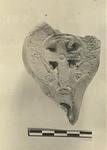 | Description: | Handle and nozzle broken off; most of reverse missing. Christian monogram on discus; "rho" to right; on rim a pattern of raised triangles, leaves, three leaved clovers, and bunches of grapes. Two filling holes on discus, below horizontal bar of cross. Reverse has double concentric grooves; some symbol within (?). Unglazed. Flaky light red clay. Type XXXI of Corinth collection. | |