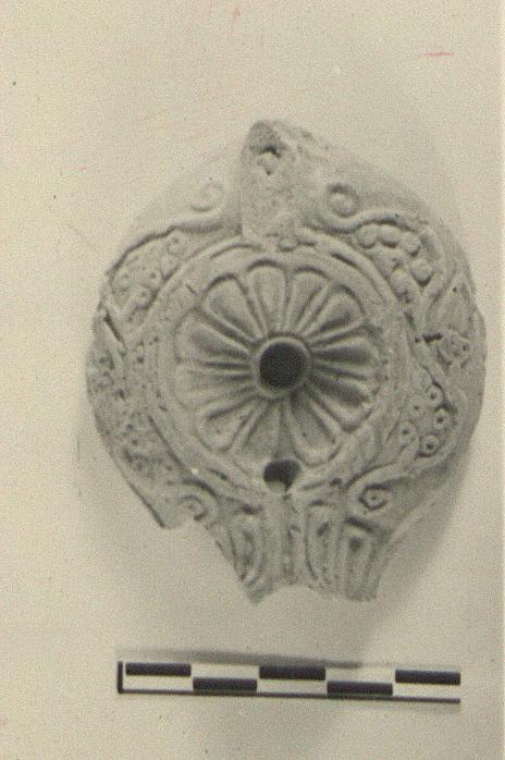| Description: | Handle and nozzle missing; top of lamp preserved. Rosette on discus; narrow channel on neck with flutes on either side. On rim, which curves down all around, as in Hellenistic lamps, a scroll pattern featuring debased bunches of grapes, vineleaves, and stems. Thin reddish glaze. Red clay. | |