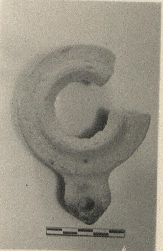 | Description: | Most of the rim, with the pointed nozzle. Discus broken away; no handle. Flat undecorated rim, with a raised band around the inner edge. Unglazed. Highly micaceous flaky buff clay. | |