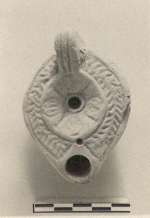 | Description: | Intact. Herringbone on rim, shallow rosette, formed of four rounded petals alternating with straight lines on discus; solid handle with two grooves in front and in back. Circular reverse with two concentric grooved circles. Unglazed. Light red clay. Type XXVIII of Corinth collection. | |