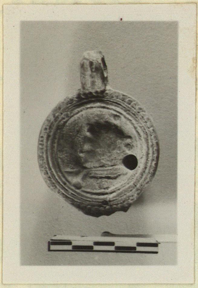 | Description: | The nozzle missing. Pierced handle, double grooved above; raised nodules around the narrow rim, then ridges. A head to the left in relief in the discus. Grooves and ridges on the reverse; cross grooves on base of handle. Traces of whitish slip or paint over all. Buff clay. Uncertain type. | |