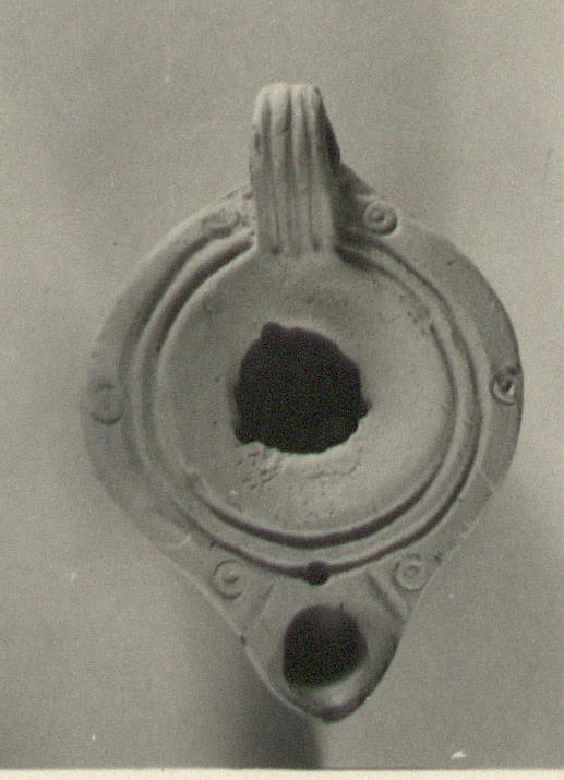 | Description: | Intact except for center of discus. Plain rim with two concentric grooves; stamped circles beside nozzle and handle and one on either side. Plain discus with central filling hole and three auxiliary ones. Pierced handle triply grooved in front and doubly behind. Circular reverse enclosed by three concentric grooves. Unglazed. Light red clay. Type XXVIII of Corinth collection. | |
