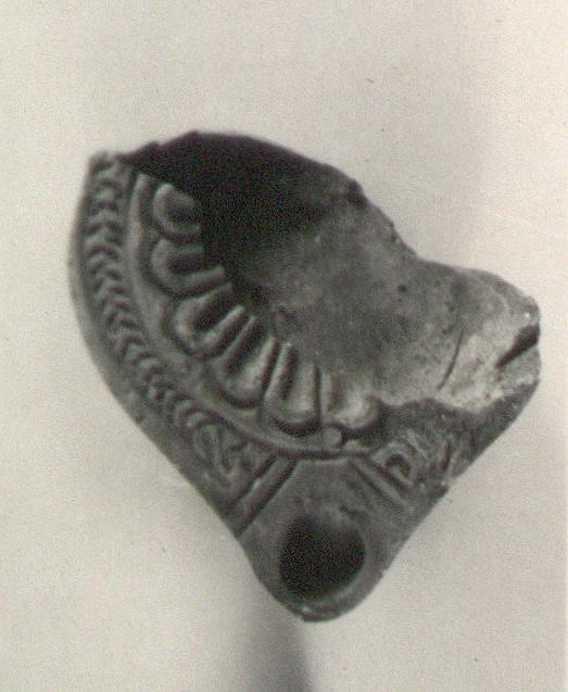 | Description: | Back part of lamp, with handle and most of discus missing, as well as three-fourths of rim. Herringbone pattern on rim, rosette on discus; circular reverse with two concentric grooves enclosing letter: "X". Thin wash, burned black to purple. Light red clay. Type XXVIII of Corinth collection. | |