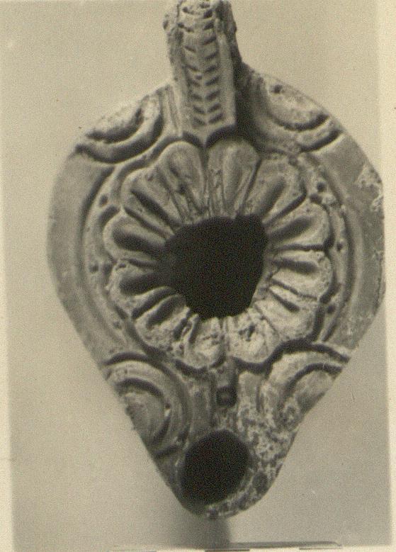 | Description: | Intact except for center of discus and chip from side. Plain rim, with groove. Double grooved semicircles either side of handle and nozzle. Rosette on discus, with a ring of tiny stamped dots around it. Solid handle with herringbone pattern on front, triple grooves on back. Circular reverse with double concentric grooves enclosing letters: "E Y". Purplish-red thin glaze. Light red clay. Type XXVIII of Corinth collection. | |