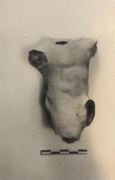 Arms raised, right leg advanced. Large round vent hole between shoulders at back. The phallos was probably a lamp.