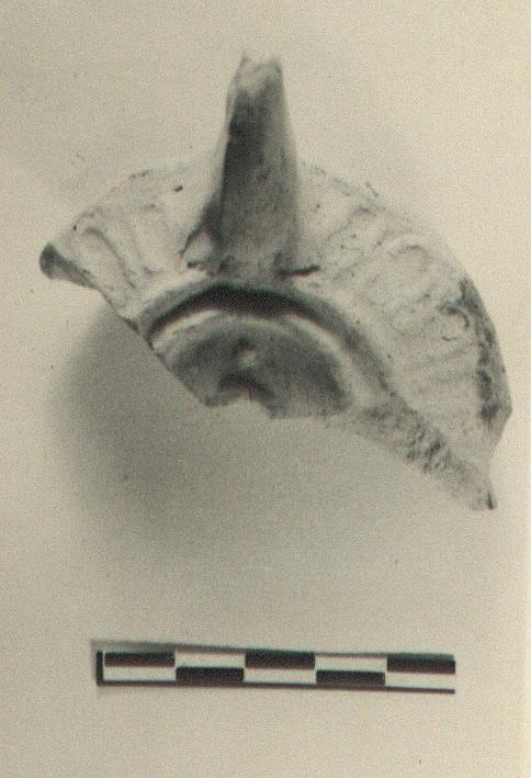 | Description: | About one-third of rim and discus with handle preserved. Tongue pattern on rim, deep groove around discus. One raised dot on discus, on axis of handle; handle high, solid and pinched. Unglazed. Pale buff clay, pinkish at core. Type XXIX of Corinth collection. | |