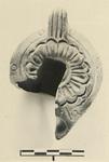 | Description: | Half of nozzle, and one-quarter of rim, discus and lower side broken away. Plain rim with a stamped circle either side of handle and nozzle and as a panel on both sides. Circular groove on rim, too. Rosette on discus; solid handle triply grooved in front and behind. Circular reverse with circular groove enclosing an "epsilon". Another letter (?) at base of handle. Reddish-brown glaze. Light red clay. Type XXVIII of Corinth collection. | |