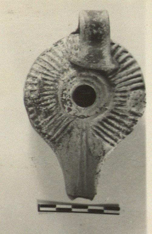 | Description: | End of nozzle missing. Low flat base, shallow body, band handle. Rays on rim with rosette on one side, scorpion (?) on other. Two grooves around filling hole. Signature on bottom in relief: retrograde. Black glaze, badly flaked. Yellow-buff clay. Type XVIII (post-Sullan) of Corinth collection, type 51 variant of Agora collection. <graphic> | |