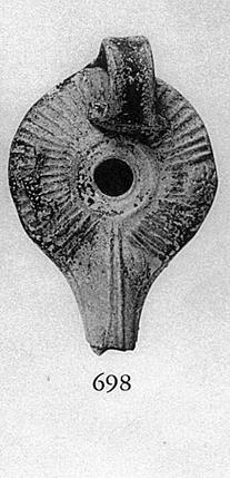 | Description: | End of nozzle missing. Low flat base, shallow body, band handle. Rays on rim with rosette on one side, scorpion (?) on other. Two grooves around filling hole. Signature on bottom in relief: retrograde. Black glaze, badly flaked. Yellow-buff clay. Type XVIII (post-Sullan) of Corinth collection, type 51 variant of Agora collection. <graphic> | |