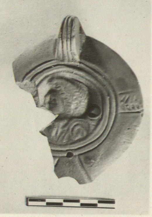 | Description: | Reverse, most of nozzle and one-quarter of rim and discus missing. Plain rim with herringbone panels; draped male bust left on discus, wearing pointed cap over heavy wavy locks. Solid handle with three grooves in front and behind. Thin reddish to black glaze. Light red clay. Type XXVIII of Corinth collection. | |