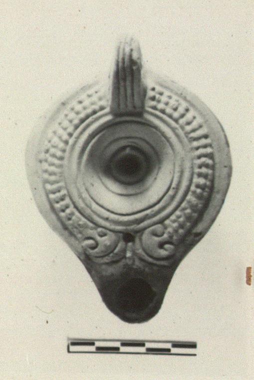 | Description: | Intact. Raised dots on lower half of body and on rim, with volutes at nozzle; discus plain except for grooves and ridges. Handle pierced with a very small hole; triple grooved above and below. Concentric grooves and ridges on reverse. Unglazed. Red-brown clay. Type XXVIII of Corinth collection. | |