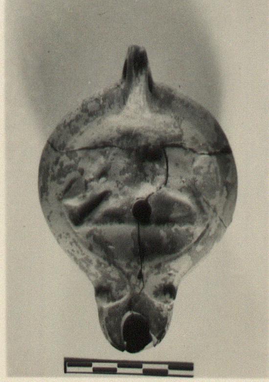 | Description: | Most of the bottom missing; nozzle chipped. Plain rim with volutes at nozzle; large shallow discus with boar to left on ground line; flat bottom; pierced handle with two light grooves on front. Red glaze much peeled. Thin fabric of light orange clay. Type XXIV of Corinth collection. | |
