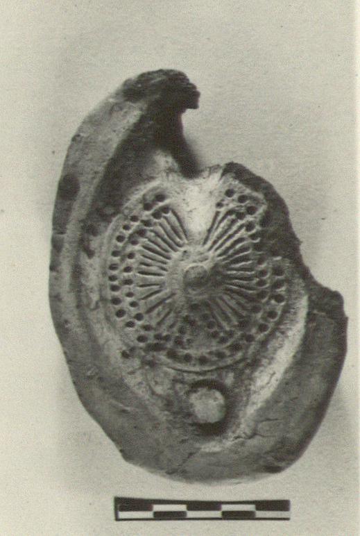 Mold for top; double row of raised dots on rim; rays on discus; central filling hole, triangle of dots around air hole on discus.