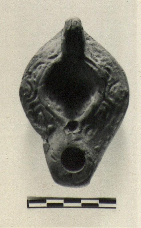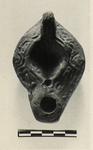 | Description: | Intact. Late shallow shape, with high lumpy nozzle; a raised band around the wick hole; traces of the punch used to make the wick hole can be seen within. Bottom concave within a low ring foot indicated by a groove. Wavy lines on rim; rosette on discus; handle double-grooved in front only; rough shallow-tail grooves at its base. Traces of thin brown wash (?). Light red to brown clay. Type XXVIII of Corinth collection. | |
