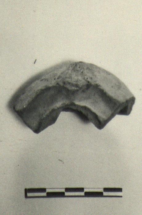 | Description: | Watch-shaped body, depressed rim separated by ridge from discus. Broken surface where side knob or handle is missing. Clay light gray, perhaps stained by modern cesspool. Uncertain type. | |
