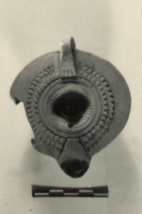 | Description: | Piece missing from one side; otherwise intact. Wreath of small leaves on inner edge of rim, then two grooves and ridges. Rays on sharply concave discus, with two raised rings around filling hole. Triangular nozzle. Pierced handle, triple grooved front and back. Graffito on bottom, between two grooves. Unglazed. Fine light red clay. Type XXVII of Corinth collection. <graphic> | |