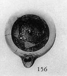 Flat bottom, rising to a small point at the center of the floor; rounded very low profile; narrow rim; spoon-shaped nozzle with large wick hole.