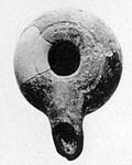 | Description: | No handle or knob. Squat body, rounding, merging with rim from which it is set off only by a very shallow groove. Nozzle, fairly flat on top, but rounding toward wick hole. Nozzle is long and pointed; wick hole large, oval. Vertical high base. Thin glaze, mottled black and red; badly worn. Pinkish clay. Type IX (?) of Corinth collection, type 33A of Agora collection. Cf. Corinth IV, ii, no. 136, pl. III. Comparable to type VII. | |