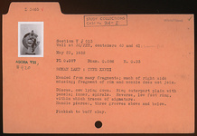 | Description: | Mended from many fragments; much of right side missing; fragment of rim and nozzle does not join. On discus, cow lying down. On rim, outer part plain with panels; inner, spirals. Reverse, low foot ring, within which traces of signature. Handle pierced, three grooves above and below. Pinkish to buff clay. Type XXVII of Corinth collection. | |