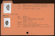 | Description: | On rim, wavy lines. Discus, plain, almond-shaped, with small central filling hole and rather large air hole. Nozzle plain. Handle solid, double grooved. On bottom, double almond-shaped groove, enclosing a cross with hatched arms. Unglazed. Pinkish-buff clay, grayish at surface. Type XXVIII of Corinth collection. | |