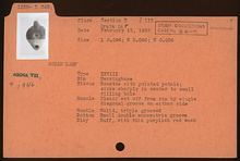 | Description: | On rim, herringbone. On discus, rosette with pointed petals; sinks sharply in center to small central filling hole. Nozzle plain, set off from rim by single diagonal groove on either side. Handle solid, triple grooved. On bottom, small double concentric groove. Thin purplish-red wash. Buff clay. Type XXVIII of Corinth collection. | |