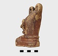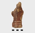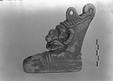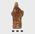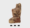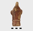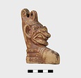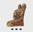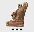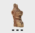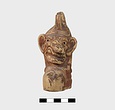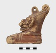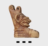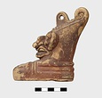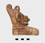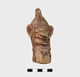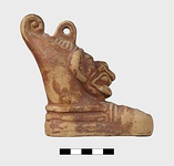 | Description: | Intact. Grotesque head in a peaked cap; floppy ears, slobbery lips, and crooked nose. Pierced grooved handle on the cap; filling hole between the handle and the peak of the cap. Poor red to brown glaze. Buff clay. | |