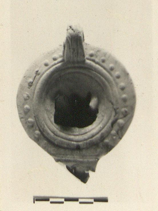 | Description: | Discus relief broken out, and nozzle broken. Dots on rim, ridges around discus; semi-pierced handle, double grooved front and back. Concentric grooves and ridges on bottom. Unglazed. Light red to buff clay. Type XXVIII of Corinth collection. | |