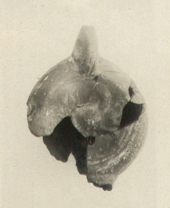 | Description: | Middle part of bottom and nozzle broken away. Fragmentary. Plain rim, sloping outward, surrounded by double circular groove. On discus, crab; close below it, small filling hole. Handle with double groove above; large perforation. Top of nozzle lower than rim. Bottom surrounded by circular groove; worn. Brown mottled away. Gray clay. Type XXV (late) of Corinth collection. | |