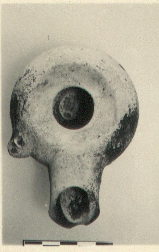 | Description: | Intact, except for chip from nozzle. Shallow spreading variety; pierced lug on side; no handle. Low ring foot. Top slightly concave; nozzle fluked. Dull black glaze, much peeled. Wheel made. Yellowish clay. Type XII of Corinth collection, type 33A of Agora collection. | |